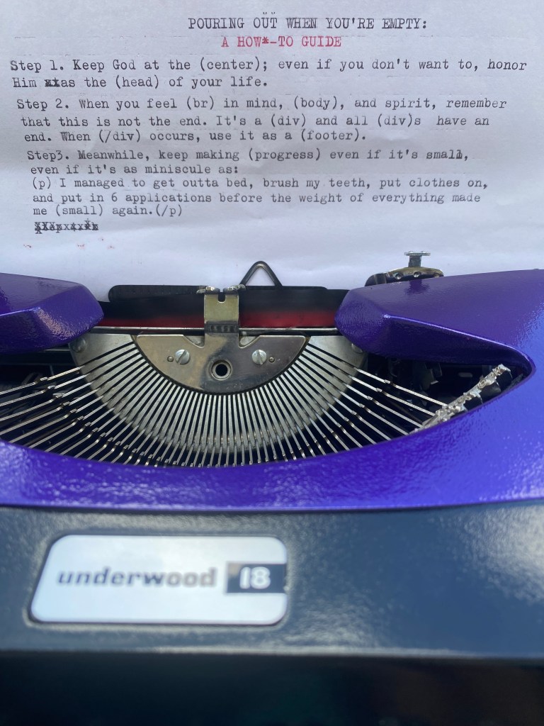 I had a conversation with my friend a few weeks ago in which I told her about a ministry idea I had: using Maya (my typewriter) to write letters to people in the church (or outside of church) who need encouragement and hope. I was excited but then the reality of unemployment and stress of depression started to hit hard and I cried out to God (and my friend) “God, why’d You give me the gift of writing if I wasn’t gonna use it?! How do I give out to others when I’m empty??”